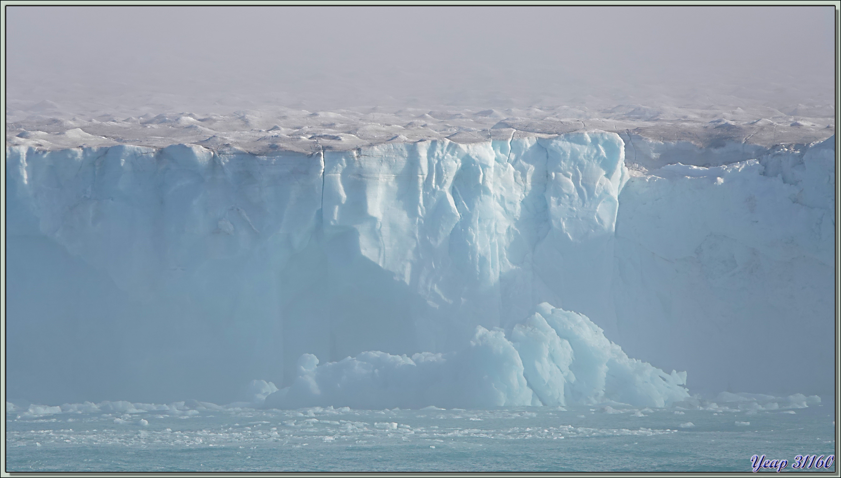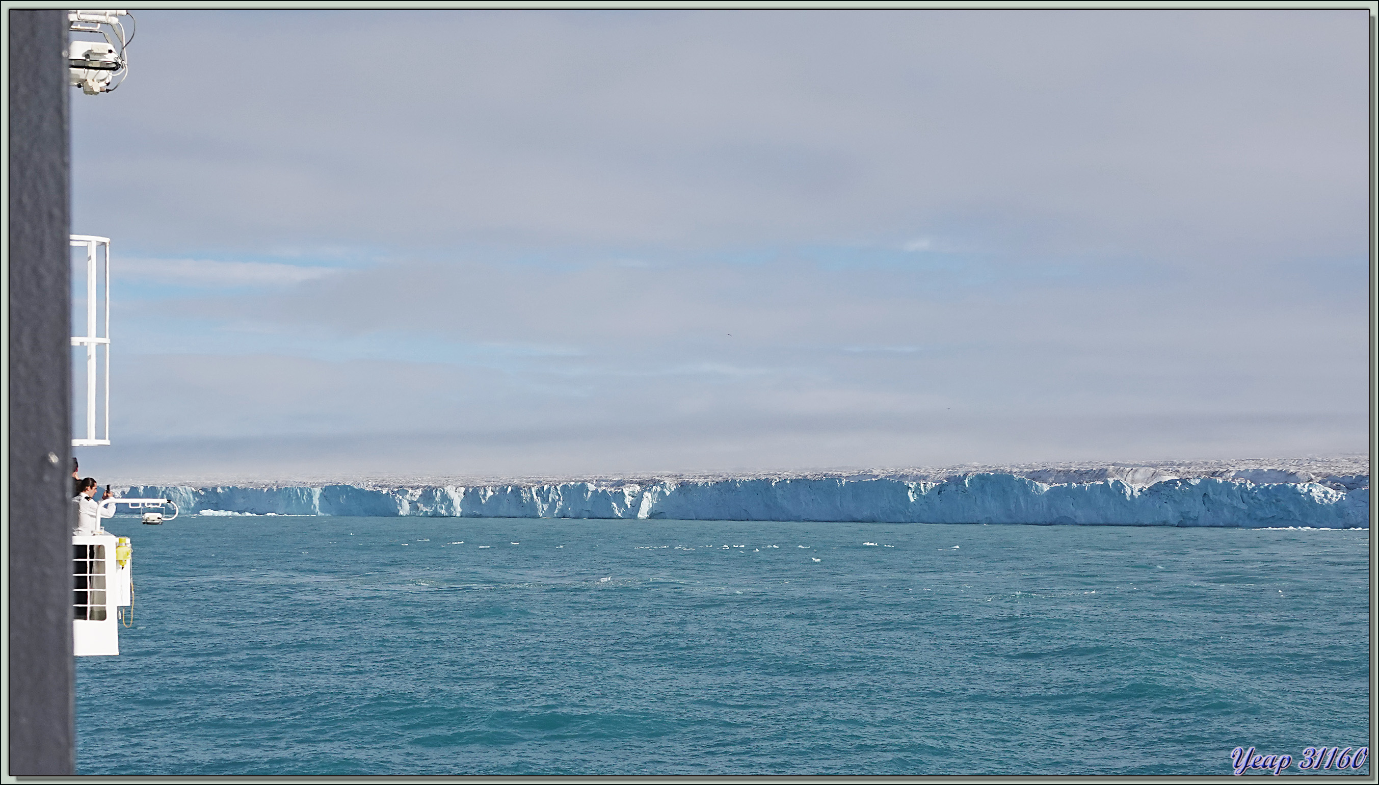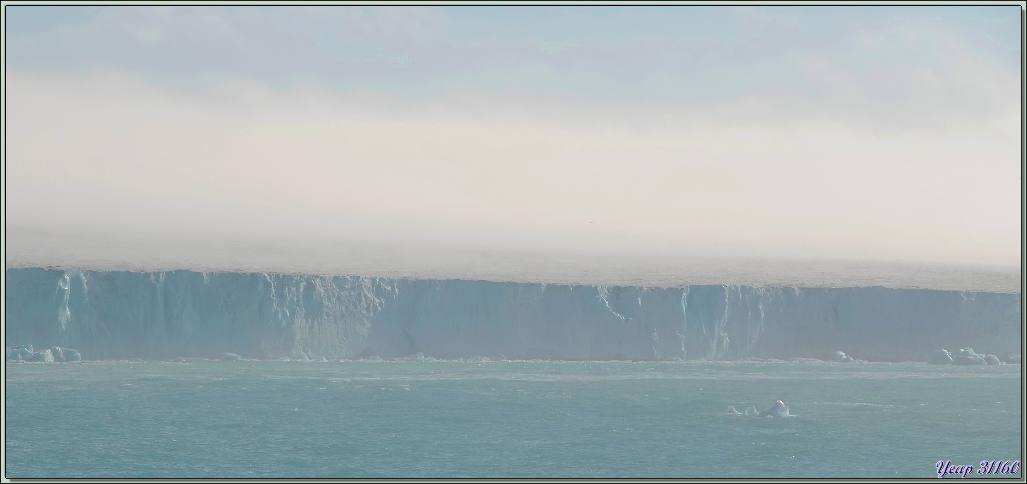 Au réveil de cette belle journée qui nous a été annoncée, c'est navigation dans une brume épaisse. Puis tout à coup, nous commençons à apercevoir une falaise bleutée, la brume se lève, et le glacier, encore paré de lambeaux cotonneux, apparait dans toute sa splendeur. Et tout ça depuis notre cabine ! Nous sommes encore situés du bon côté* ! Je prends les premières photos depuis l'intérieur, puis je me me décide à enfiler ma parka et de passer sur le balcon. Derrière la brume, et devant le paysage quasiment complètement dégagé !