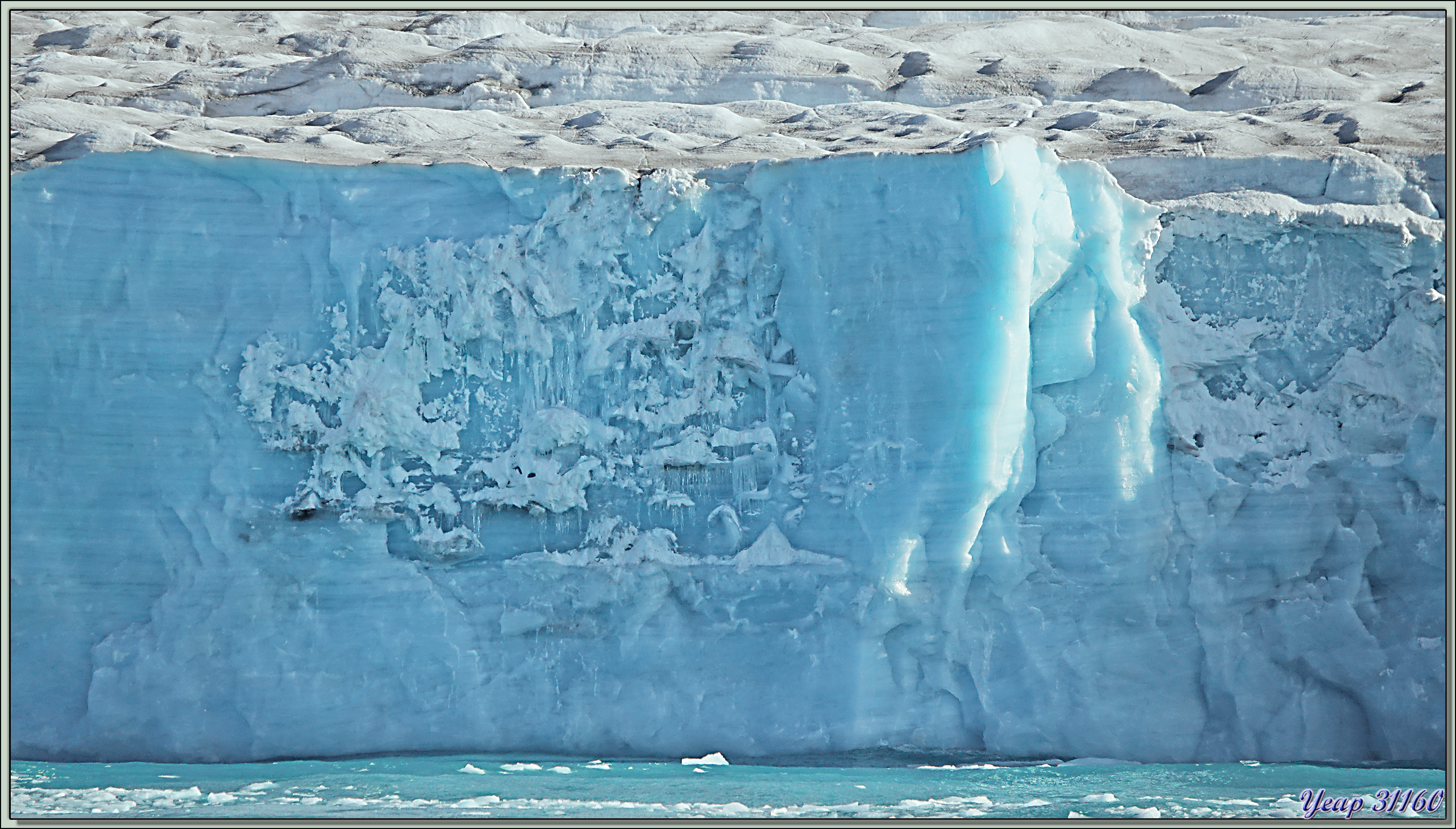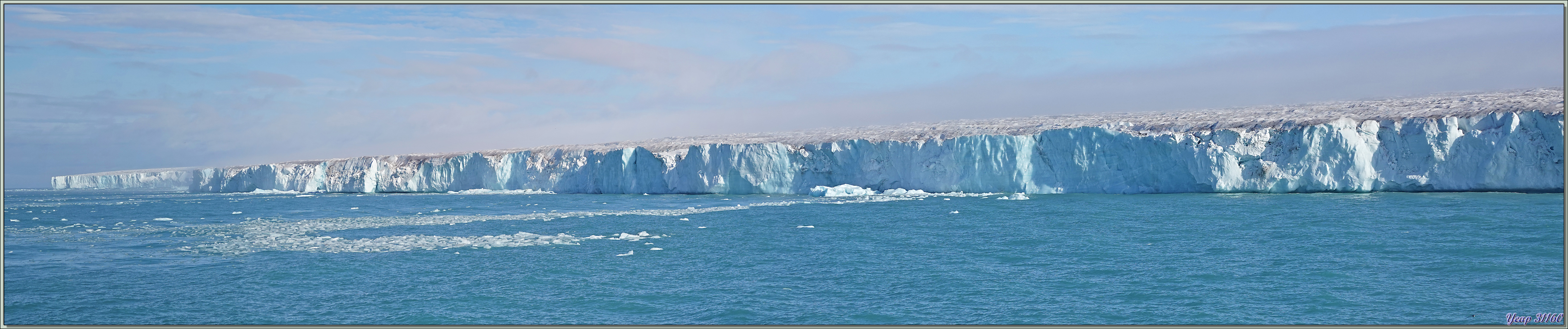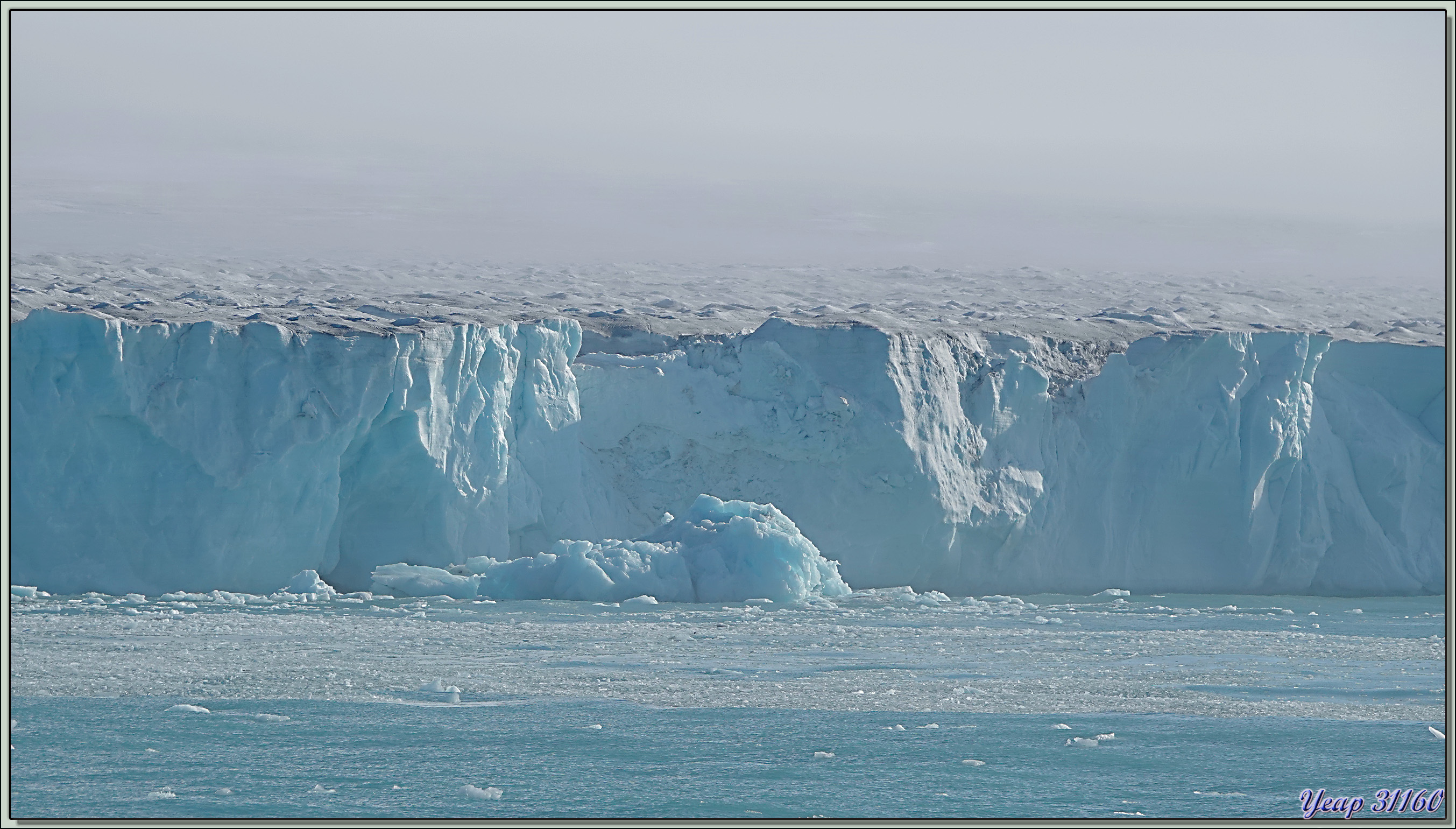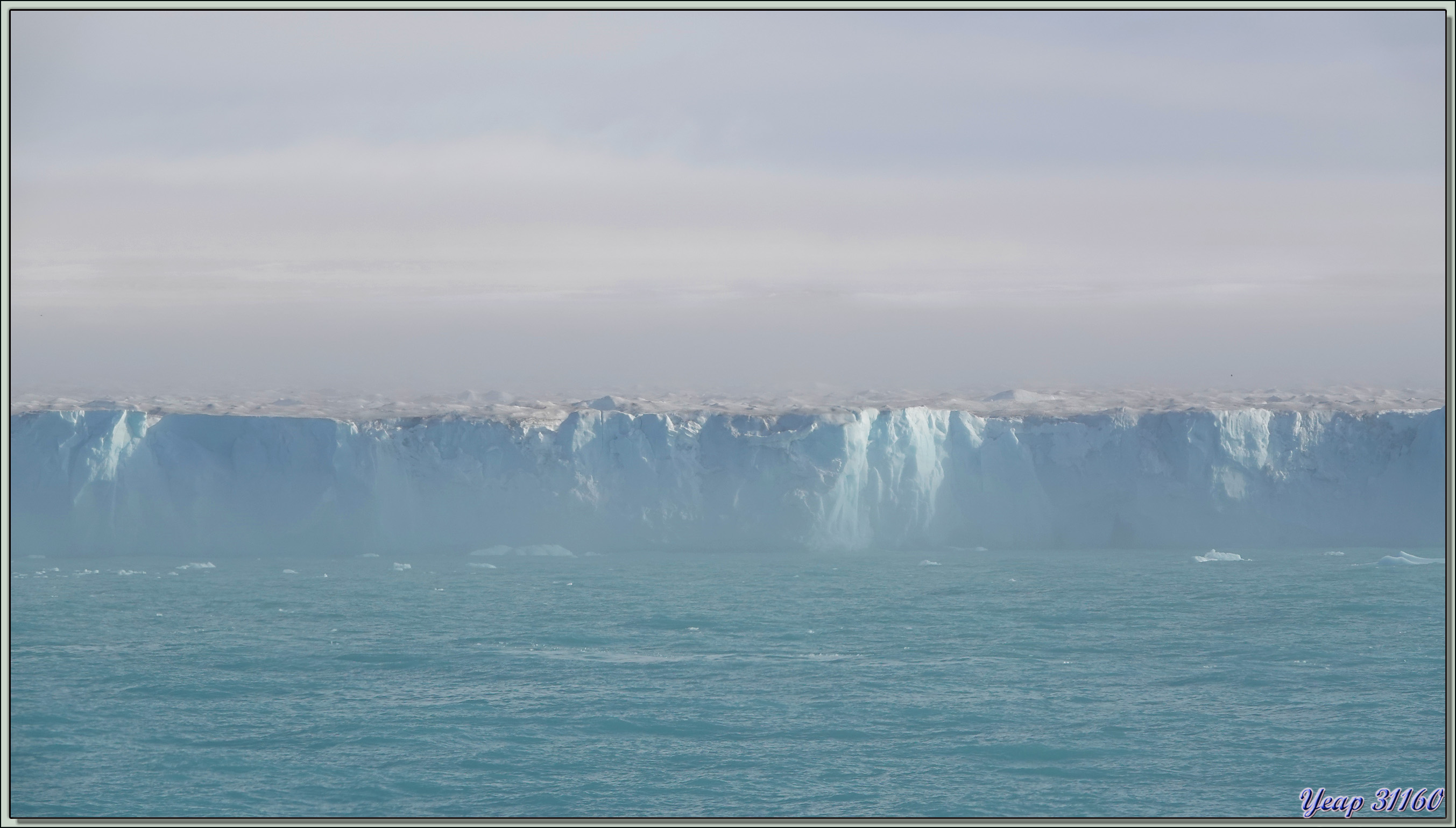 Au réveil de cette belle journée qui nous a été annoncée, c'est navigation dans une brume épaisse. Puis tout à coup, nous commençons à apercevoir une falaise bleutée, la brume se lève, et le glacier, encore paré de lambeaux cotonneux, apparait dans toute sa splendeur. Et tout ça depuis notre cabine ! Nous sommes encore situés du bon côté* ! Je prends les premières photos depuis l'intérieur, puis je me me décide à enfiler ma parka et de passer sur le balcon. Derrière la brume, et devant le paysage quasiment complètement dégagé !
