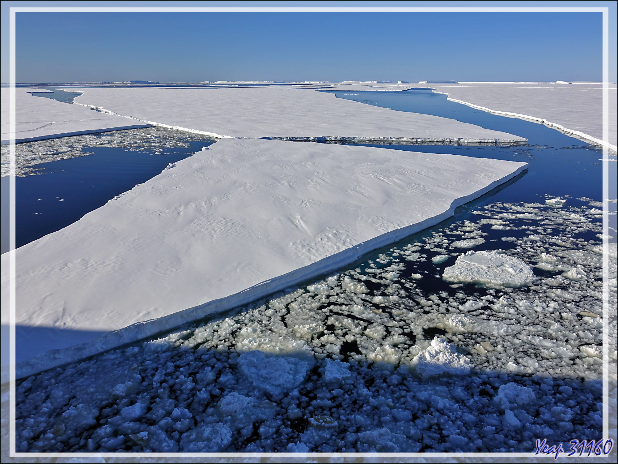 Notre expérience de ce débarquement avorté : donc nous partons avec notre groupe (nous sommes le deux ou troisième), bottes aux pieds, déjà marcher dans 40 cm de neige fraîche, ce n'est pas facile, et quand on voit que l'intérêt de s'approcher des manchots n'est plus de mise, nous décidons d'abandonner, de faire demi-tour et de rester autour du navire. Nous nous dirigeons vers la proue (photo), et là, je m'aperçois qu'une faille dans la glace est en train de s'ouvrir, très petite, mais pas du tout rassurant. A ce moment, le commandant du navire passe à côté de nous, s'avance et discute avec des guides qui se trouvaient là. Pas rassurés par cette faille dans la glace, nous décidons de remonter à bord.