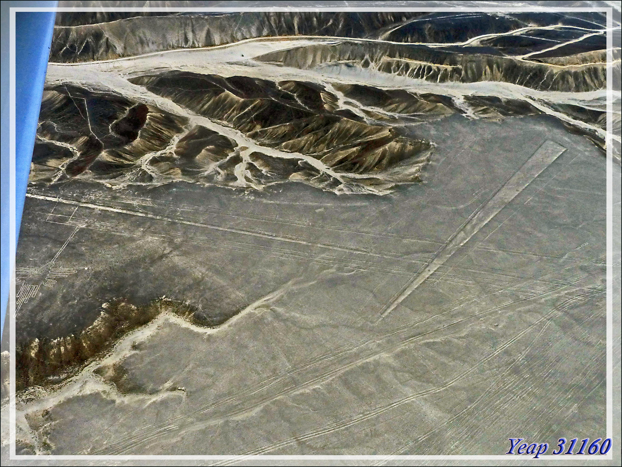 A côté du Colibri qui fait 100 m de longueur de la pointe du bec au bout de la queue (Colibri qu'on voit à gauche, remarquez aussi la brume juste sur le plateau de ce géoglyphe), des lignes et un très beau triangle isocèle de plus de 350 m de hauteur.