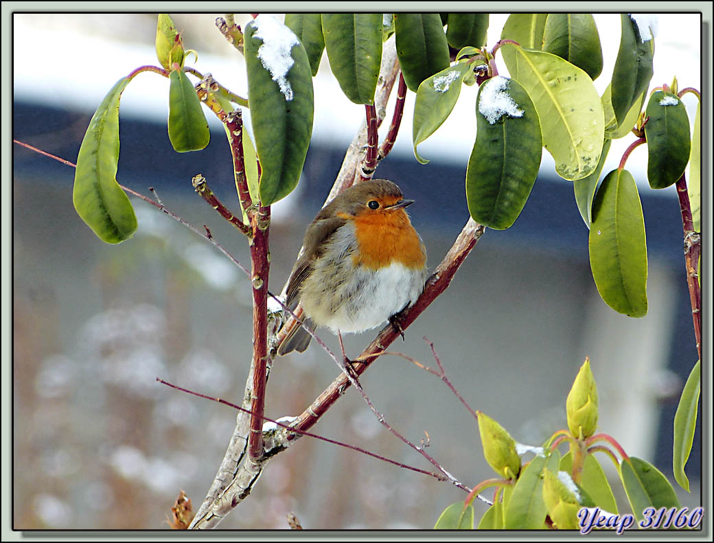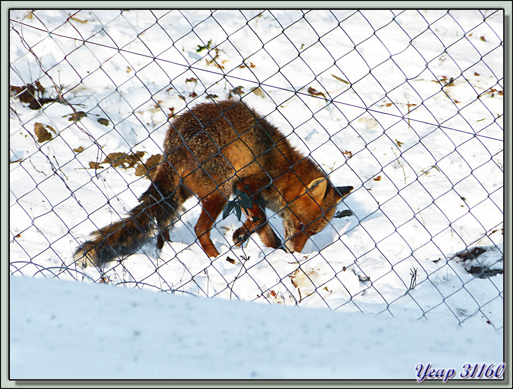 Juste aperçu et aussitôt parti, aussi soudainement que je l'ai vu faire "coucou" (cette photo est légèrement recadrée) derrière notre clôture, de saisir l'appareil photo et d'arriver à avoir deux photos correctes. Zoom 750 mm, 1/500 s et 1/250 s.