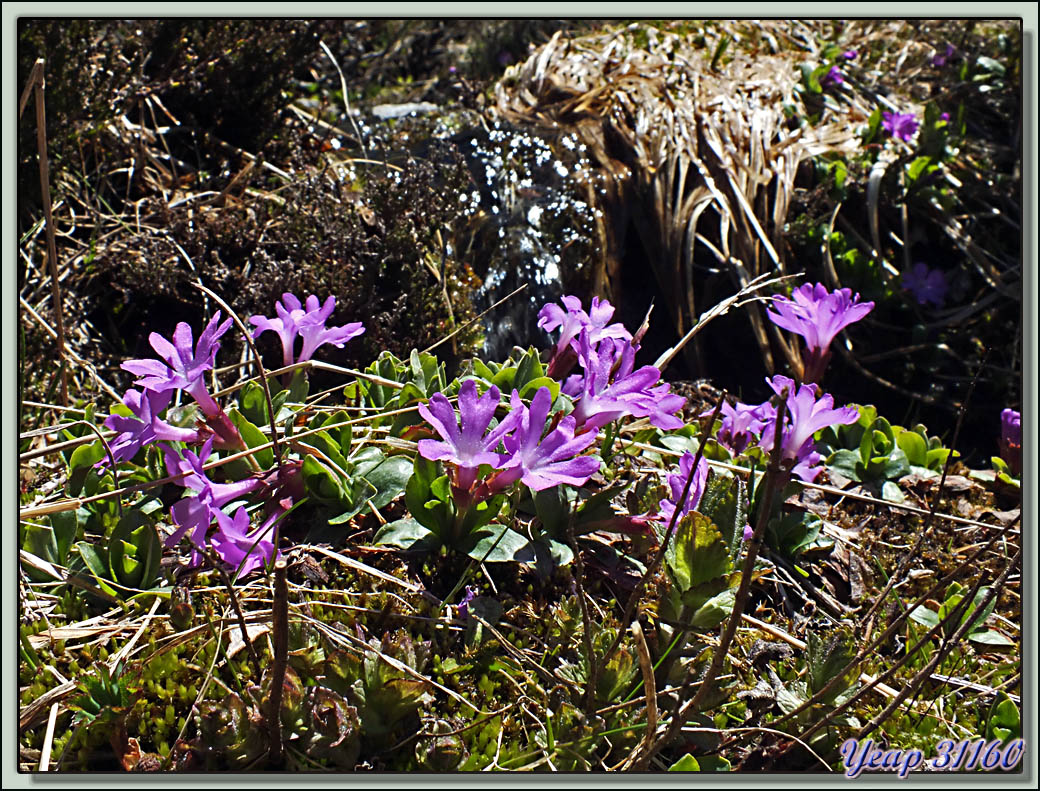 Mais ce site est très pro et peu convivial, il faut au moins avoir le nom de l'espèce pour s'en sortir, dommage car il y a beaucoup de fleurs répertoriées. Cette petite primevère est presque endémique des Pyrénées et ne se trouverait (conditionnel) ailleurs qu'en Haute-Savoie et elle serait assez rare chez nous. Elle vit apparemment dans les zones très humides, d'ailleurs les pieds, les bas des pantalons et les genoux s'en sont aperçus lorsque j'ai voulu faire ces photos.