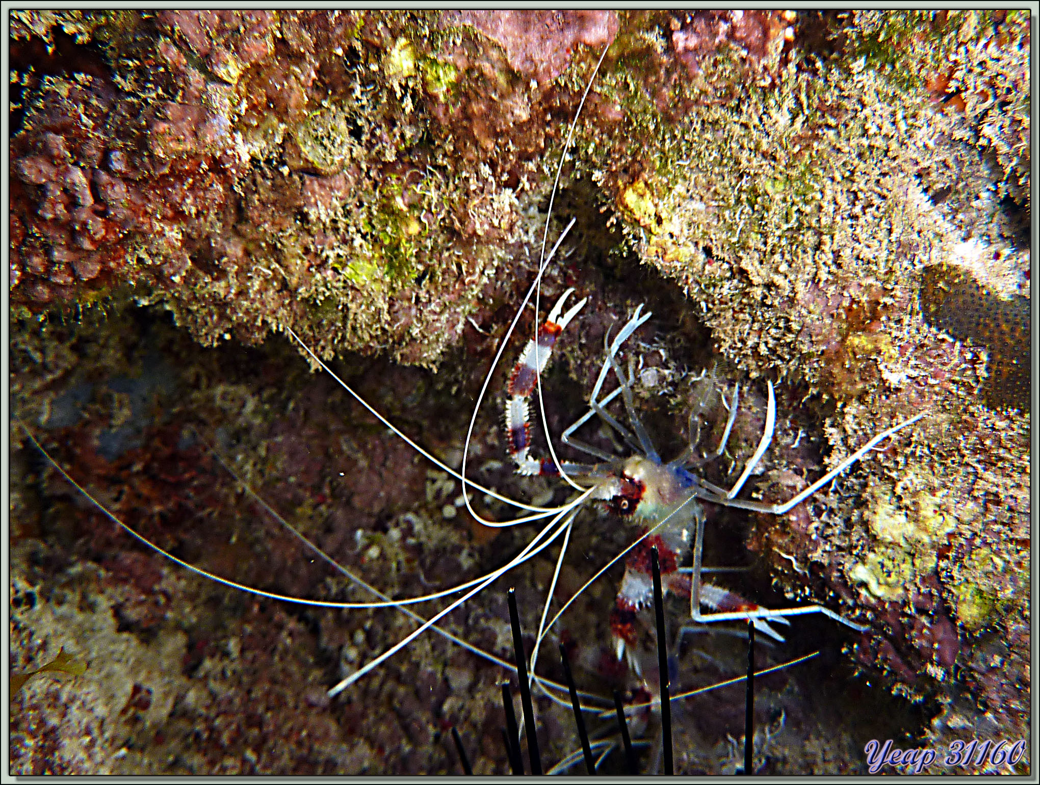 Celle-ci était belle mais floue (la précédente n'est pas très nette non plus) je l'ai un peu rattrapée, du coup elle devient "présentable". J'ai énormément de déchets dans mes photos sous-marines, même ici où l'eau était d'une limpidité absolue. En plus ces crevettes se trouvaient en bordure de leur trou, repérées grâce à leur antennes, en plus, aussitôt qu'on approche, elles s'enfoncent dans leur tanière. Et pour faciliter les choses, des oursins diadèmes à longues épines partout... Les deux photos ont été prises avec le flash, pour celle-ci j'ai tourné l'appareil ce qui a permis de mieux éclairer le trou, le flash donnant par en-dessous.