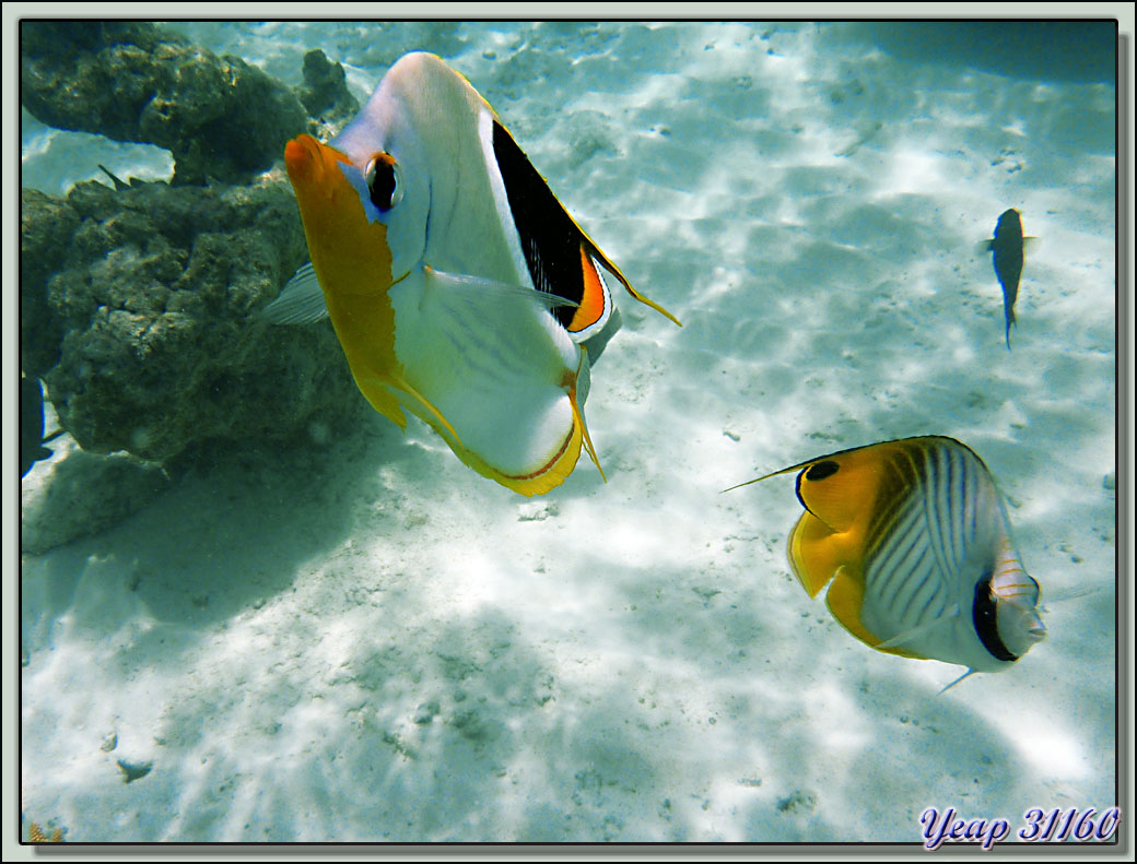Snorkeling dans le lagon de la pension Raira Lagon : Poisson-papillon à selle noire (Chaetodon ephippium) et Poisson-papillon cocher (Chaetodon auriga) - Rangiroa - Polynésie française posté le dimanche 20 janvier 2013 11:43