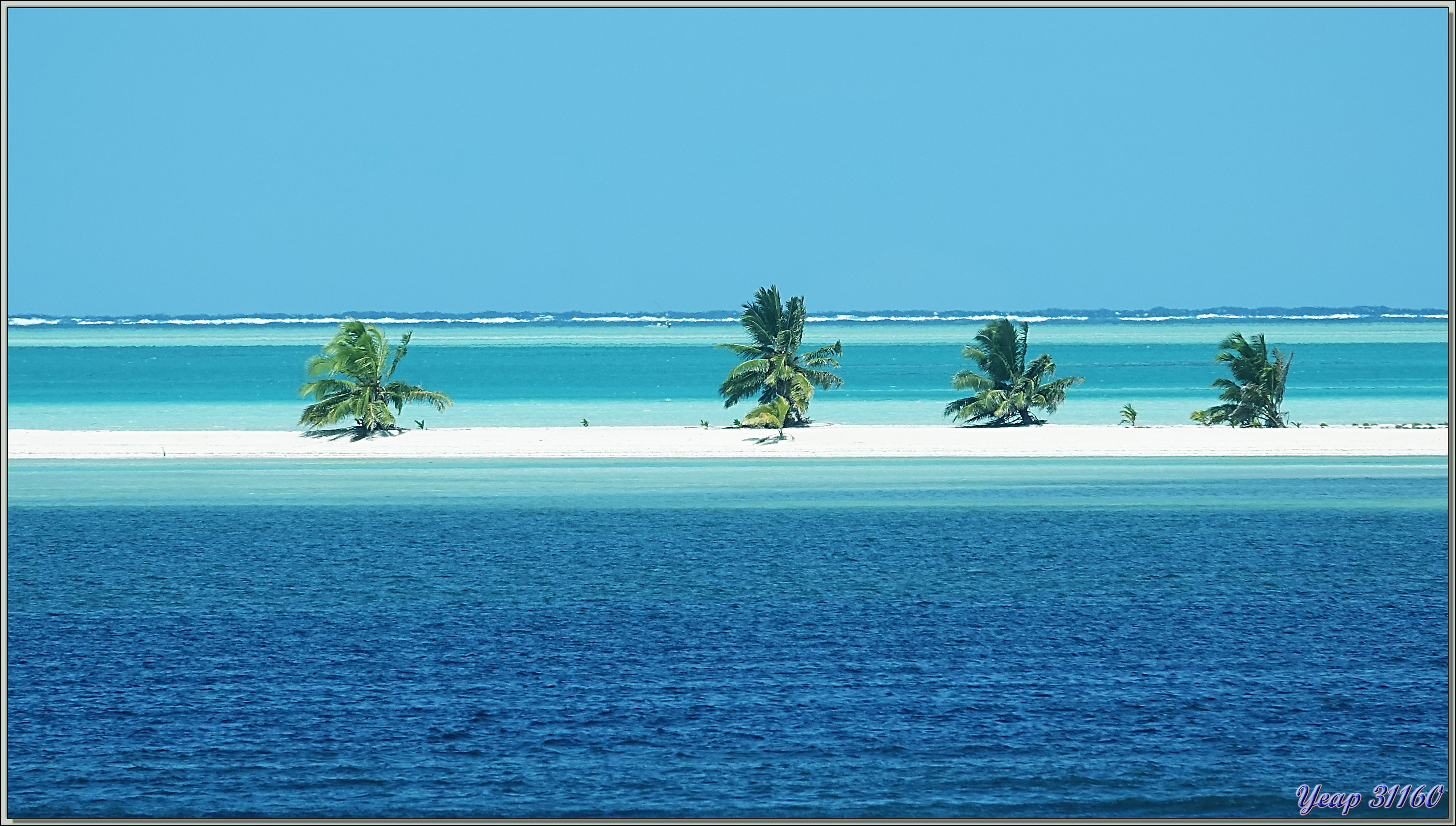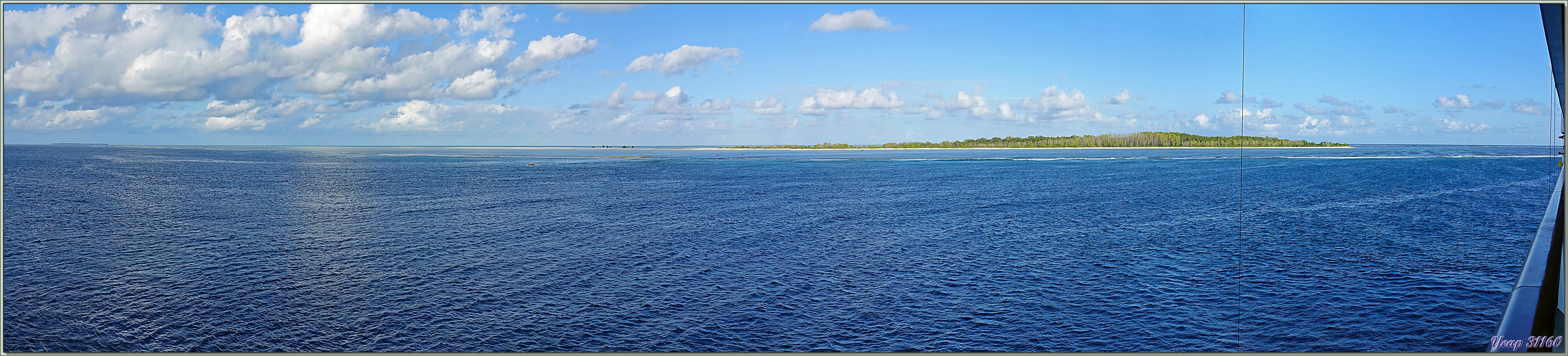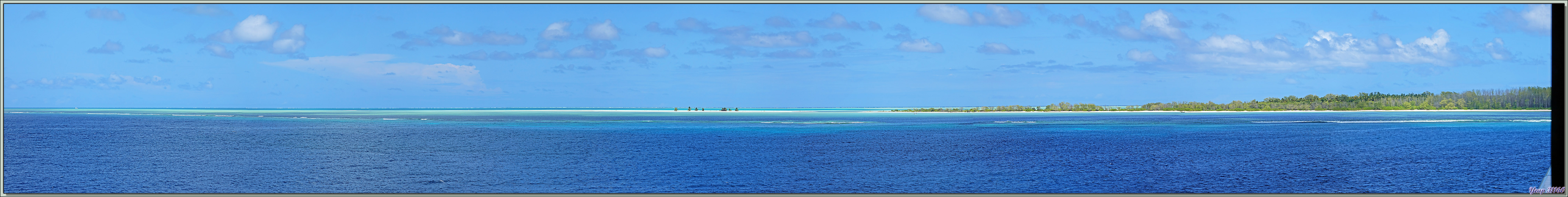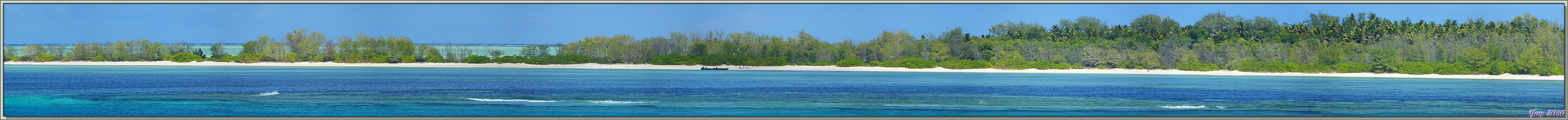 Tout à gauche (cliquez sur l'image pour avoir le panorama en grand format) l'île Alphonse qui a son propre atoll, à sa droite, l'îlot Bijoutier qui fait partie de l'atoll Saint-François, et la totalité de l'île Saint-François où on devine les pourtours de son atoll.