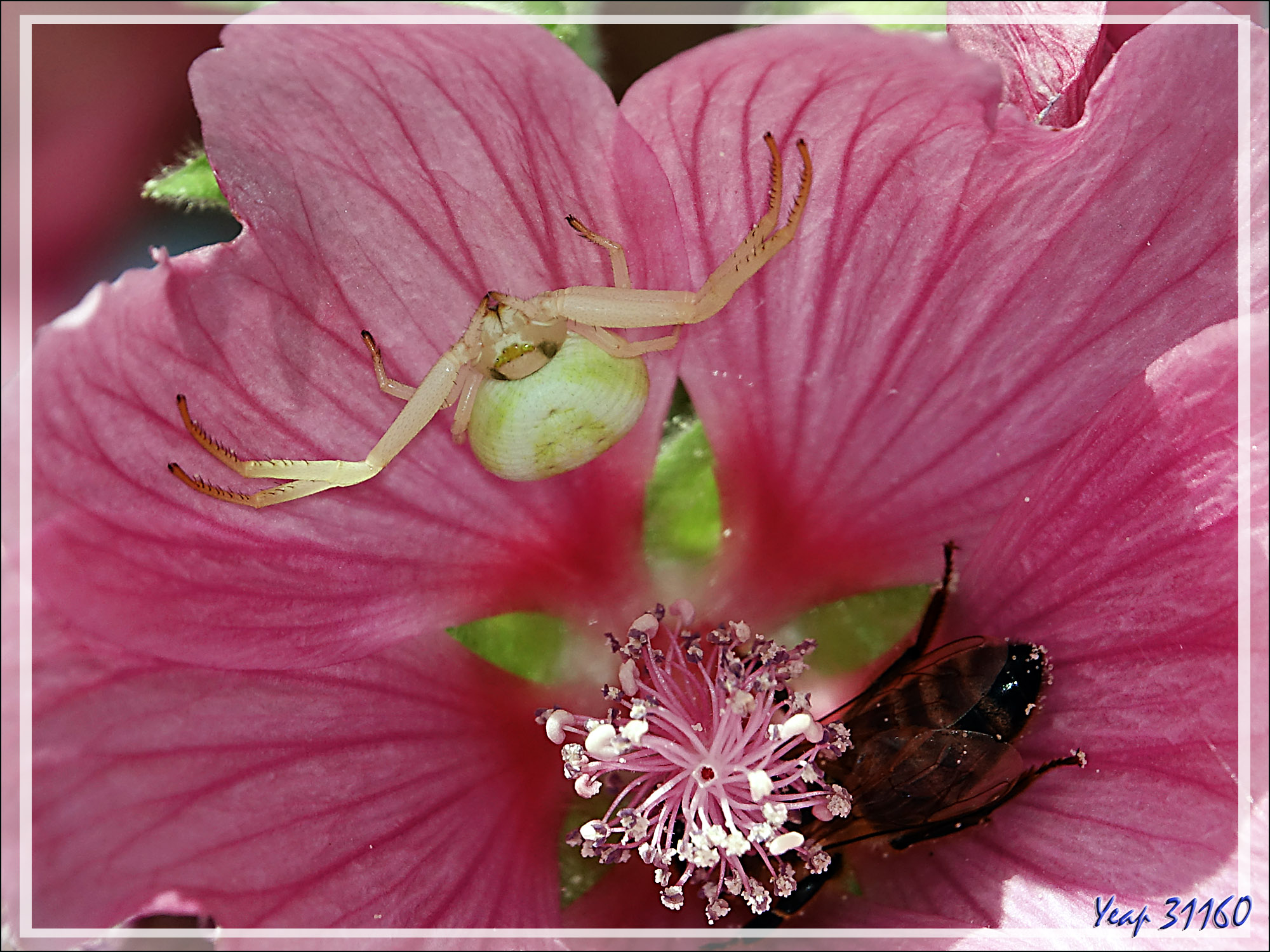 Rappel du 4 juillet : Pour essayer de valider le nom de "variable" et surtout le fait qu'elles s'adaptent à la couleurs des fleurs, j'ai délocalisé cette araignée d'une fleur jaune et l'ai mise dans les lavatères roses ...