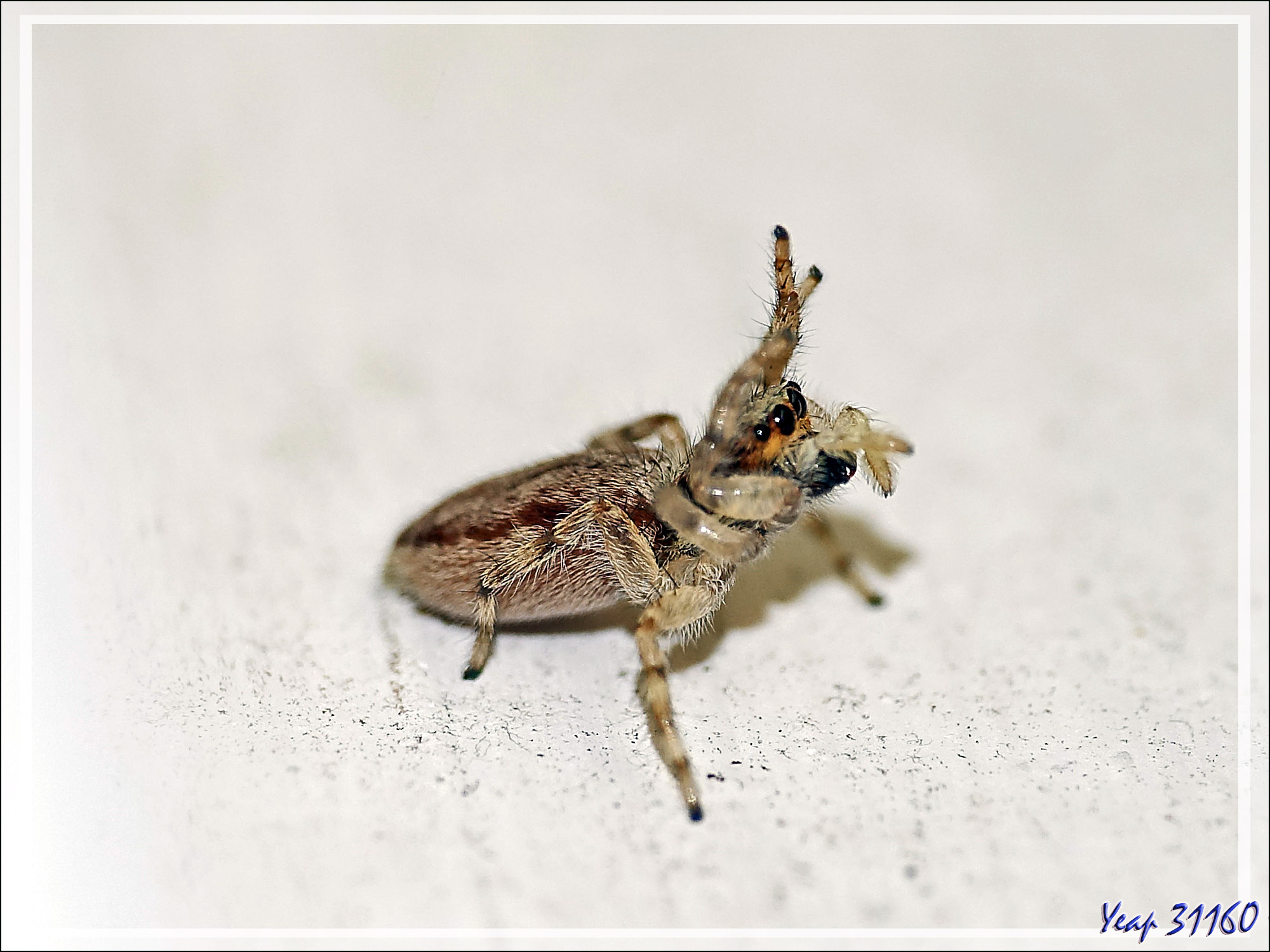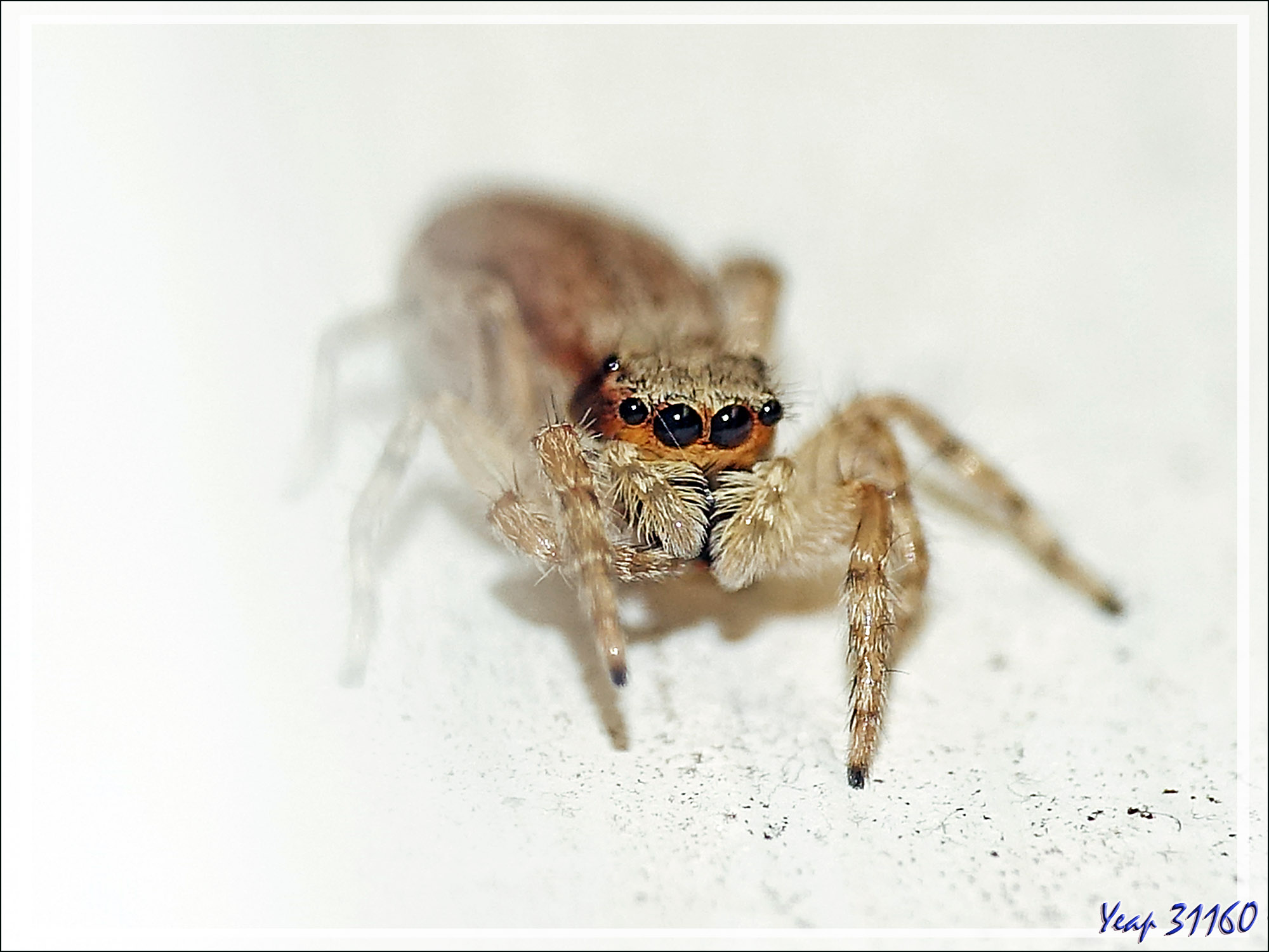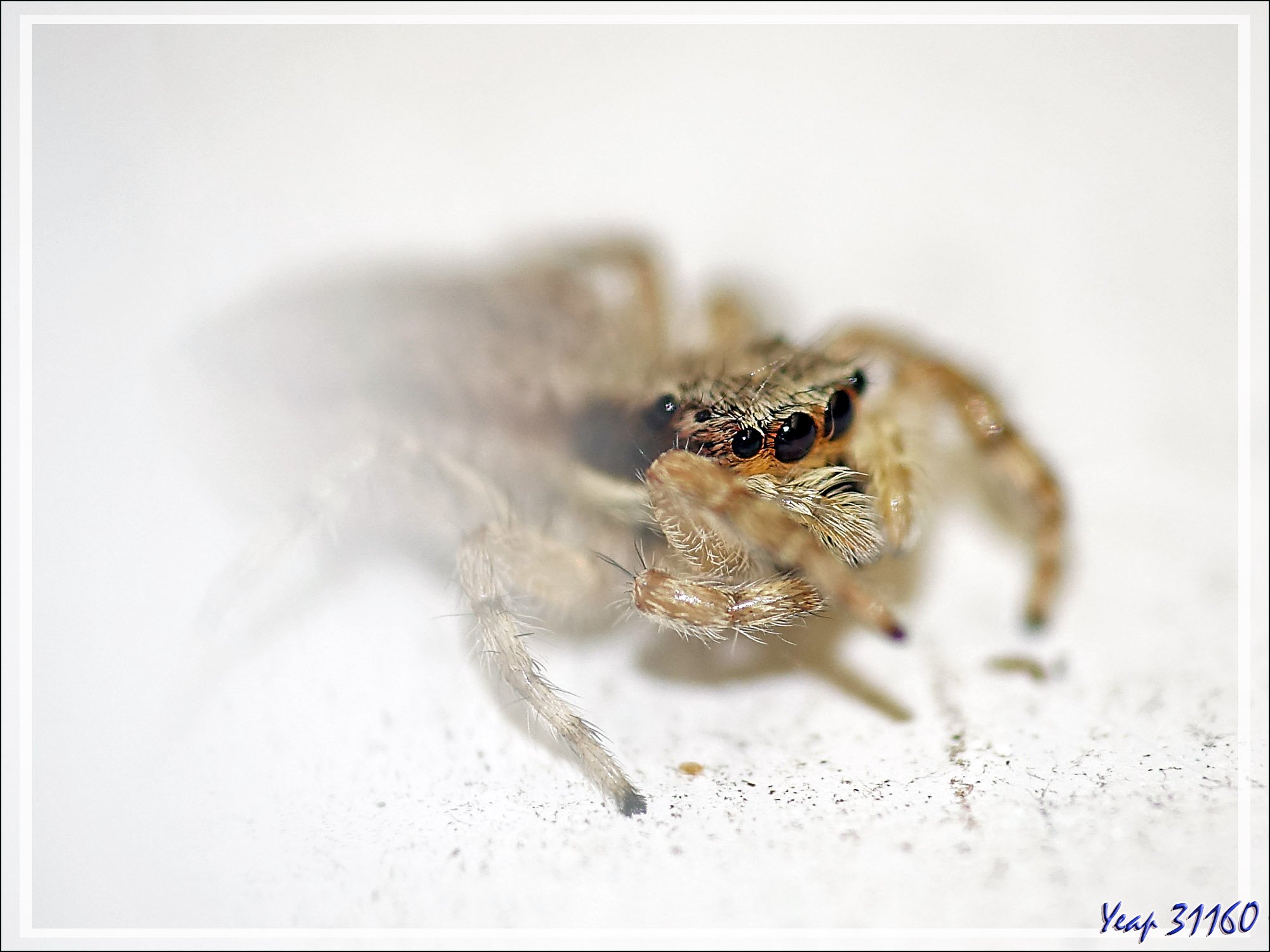 Et enfin, lors de la prise d'un peu de repos avant le repas, sur la balustrade de notre varangue, je repère une belle petite araignée sauteuse, indéterminée car très peu de photos sur les araignées des Seychelles ...