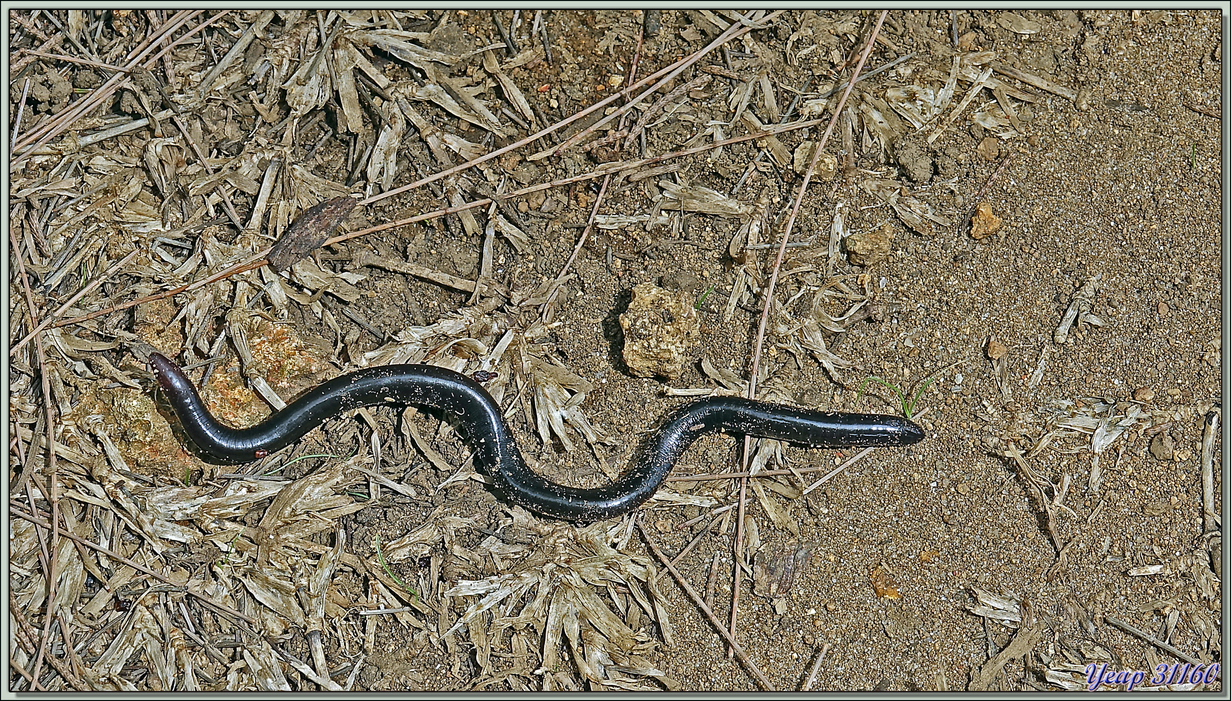 J'ai d'abord cru à un très long iule (mille-pattes), mais de près je n'ai pas vu de pattes, puis à un bébé serpent ou à un énorme ver de terre noir, et ce n'est qu'en cherchant sur internet que j'ai vu ce que c'était. Grâce à Google Lens, j'ai lancé la recherche avec ma photo, et bingo ! Apparemment le nom scientifique serait exact car c'est un amphibien endémique des Seychelles et plus particulièrement de Silhouette.